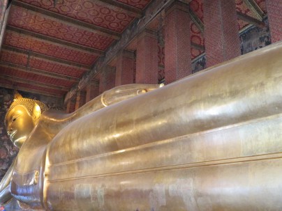 many pictures as you can along with all of the other tourists. This place was busy! It was so hard to squeeze in to get a picture, plus it was really hot in the building, so I didn’t spend too much time in there. Then I went to the actual temple of Wat Pho. The line-up was quite long so I took my shoes off, waited for about 15 minutes to spend ten seconds at the entrance to take a picture and leave (you’re not allowed to go inside).
