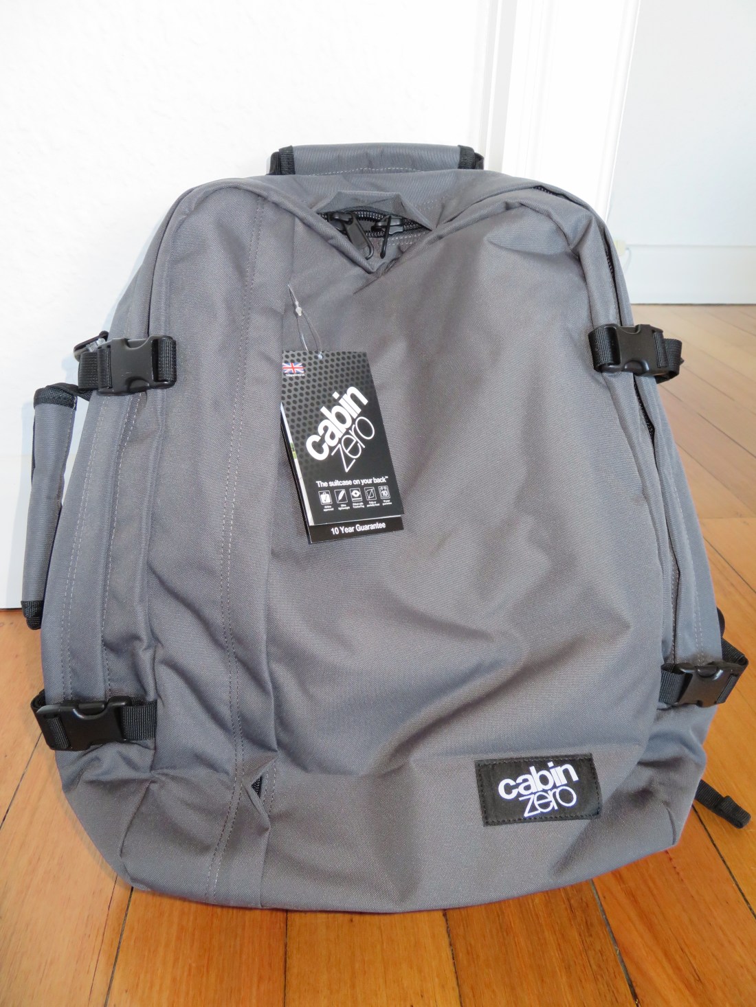 step was to find the lightest bag that I could. After tons of research, I ordered a Cabin Zero bag from the UK, which cost me $110 AUD. This 44L bag is awesome because it only weighs 0.76kg, which leaves me a lot of weight to add. It has a ten year warranty, and it has a unique lost-and-found tag so I can trace my bag if it gets lost. It opens like a suitcase would, which makes finding items a lot easier.