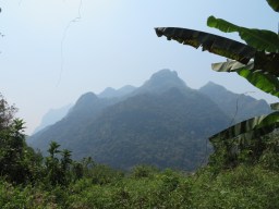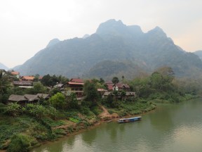 stopped at the van, where we all had to get out of the tuktuk, grab our things to put in the van, and get in. This was the disadvantage of being one of the first ones picked up – I was one of the last ones off of the tuk tuk, and the last one to enter the van so I was forced to the middle seat in the back, sandwiched between a random guy and the huge stack of luggage, some of which was taking up half of my seat space. My only two options were to 1) squish behind the big bulge coming into my seat, or 2) rest my head on the bag and use it as a pillow. Within the first five minutes of us moving, I suddenly remembered my motion sickness pills. I guess I forgot to take them 30 minutes beforehand, and they COULD end up making me feel drowsy, but I wasn’t going to take any chances this time. I’d rather face drowsiness than one or two days of feeling sick. It wasn’t a hugely swerve-y ride, but it was definitely a bumpy ride!! Many times, I couldn’t help bouncing into the guy right beside me. Luckily, the ride wasn’t too long and we arrived about three hours later, right at noon. Nong Khiaw is a not-so-secret mountain village, and it’s absolutely breathtaking with the surrounding mountains.