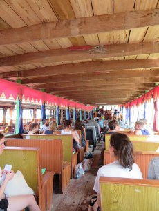 Luang Prabang until about 4pm, so we were in for another long boat ride. I got to the boat at about 10 minutes to 9 and by that time, half of the boat was already full. The full part of the boat had tables, so all that was left in the back of the boat were seats that literally seemed to be taken out of multiple cars (and therefore reclined!), so they were set up two by two down the middle of the boat and along the sides. I grabbed one of the seats along the side right before the huge 10+ group of British people (who spent the entire boatride drinking the day before) came and took all of the remaining seats. Unlike the day before, there wasn’t any room to spread out so I was confined to my one seat and the girl beside me seemed to take not only her own part of the seat but also part of mine (for no reason other than not seeming to realise that there were two separate seats). Anyway, I just put my earphones in to tune everything out, and kept myself busy for the next seven hours.