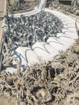 dollars, and THEN exchange the dollars into Laos Kip when I got to Laos because I’d lose less money that way. This actually surprised me because I assumed I’d lose less money by changing baht into kip directly. Paulina and I walked about 15 minutes to a currency exchange place so I could change all of my money, and then we continued another 20 minutes to the bus station. We found a big sign that said ‘White Temple’ and saw that the bus was supposed to leave in 4 minutes (good timing!). We got on, paid 20 baht (88 cents), and arrived at the White Temple about 20 minutes later. We had to pay 50 baht ($2.18) for entry, and it was extremely crowded when we got there!! Online, there are so many pictures of people alone with no one around, and I have no idea how they would have managed to get a picture like that unless it was Photoshopped. The White Temple is extremely unique because the person who designed it added a bunch of random features, such as heads hanging from trees, or a bunch of hands coming out of the ground.